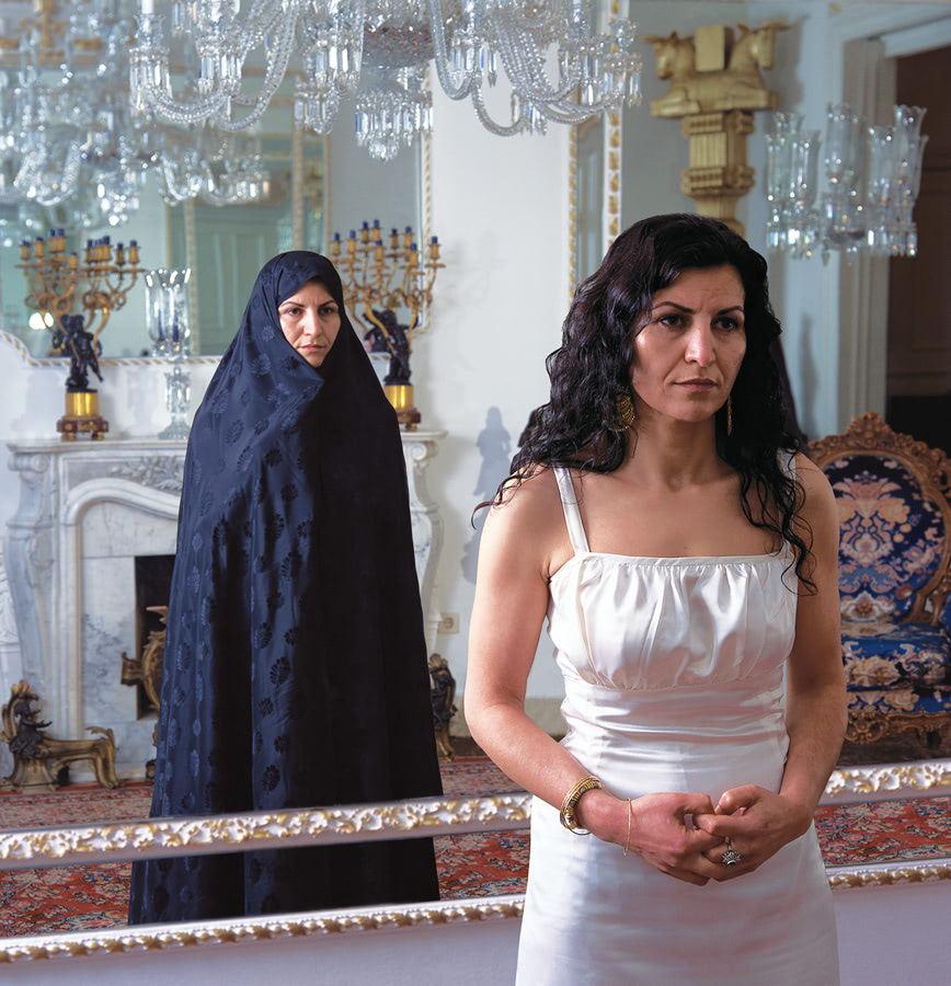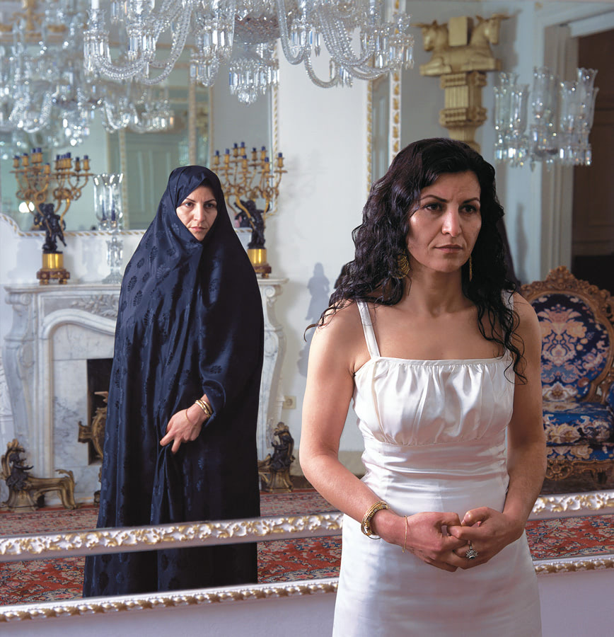 The two women in each photograph show the artist herself, in different clothing and attitudes. One of the female figures wears a chador (cloth). Head and body are enclosed, with the exception of the face, with a dark material. The word, chador, is persian and means something like 'tent'. The chador is specifically Iranian and its history clearly illustrates how a dress rule can reflect the implementation, exercise and control of power. Whereas in the mid-twenties the chador was strongly forbidden under the Pahlawi Dynasty, after the Iranian Revolution at the end of the seventies it became compulsory for all woman, including non-muslims. The chador could leave only the face and the hands free. The other figure in the photograph, in contrast, wears an off-the-shoulder, white dress. Her softly curling hair flows over her bare shoulders and arms.