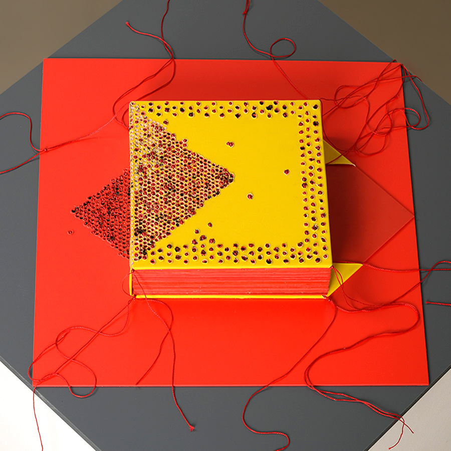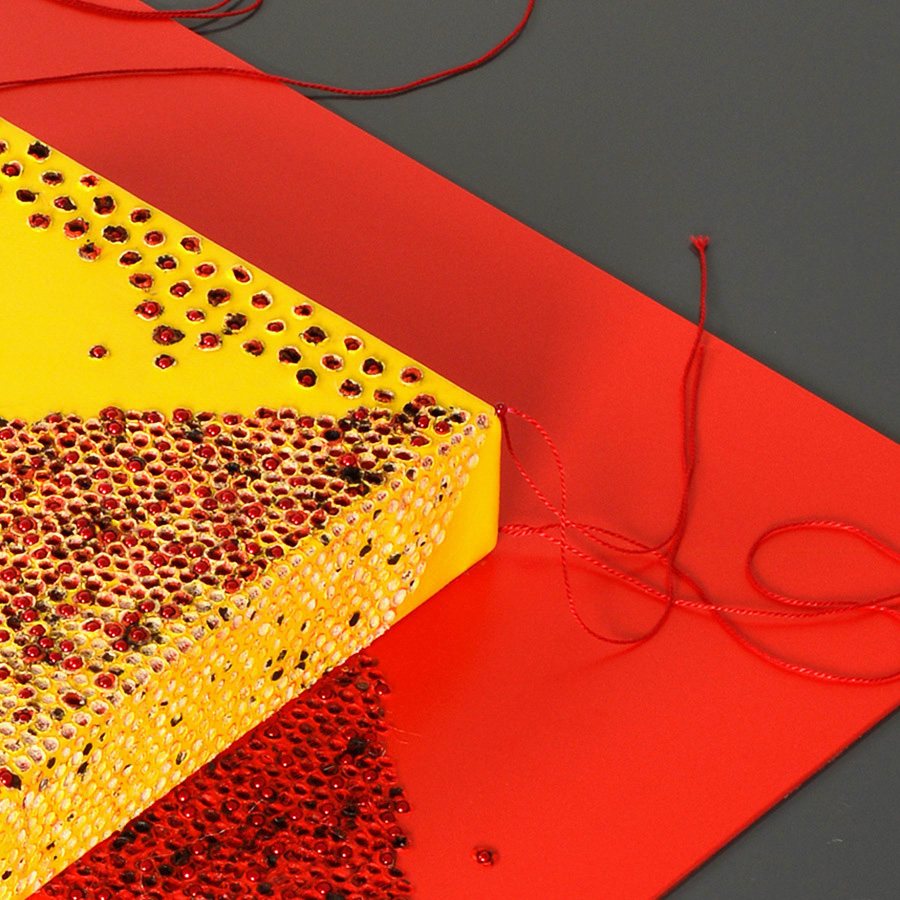 PVC sheets, faux leather, artificial pearls, yarn; perforated and fired, 70.7 x 70.7 cm