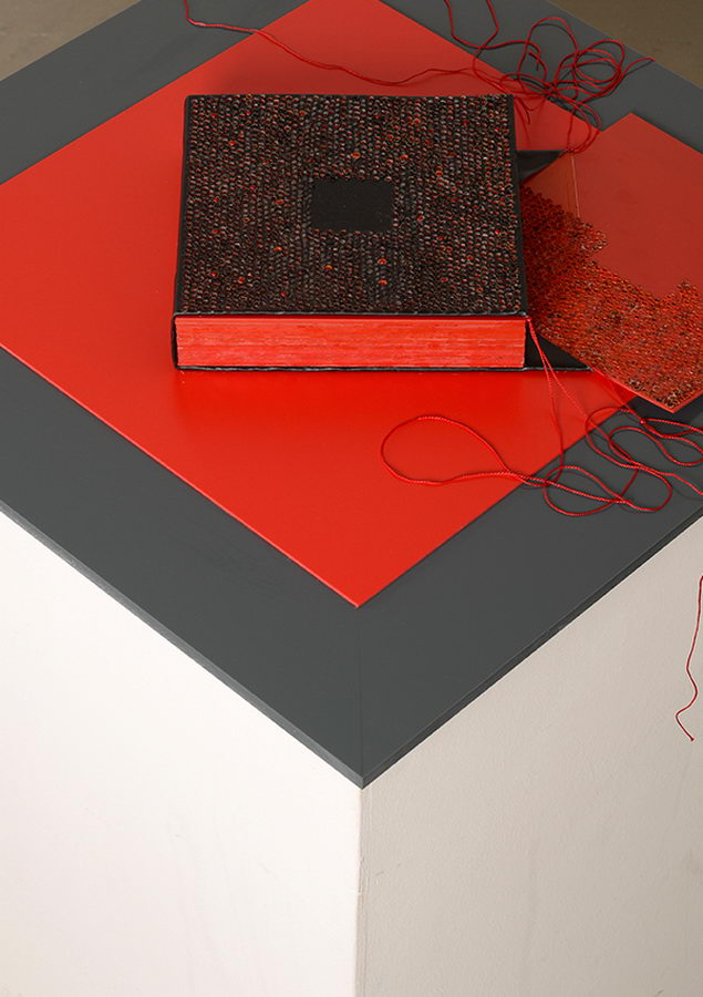 PVC sheets, faux leather, artificial pearls, yarn; perforated and fired, 70.7 x 70.7 cm,